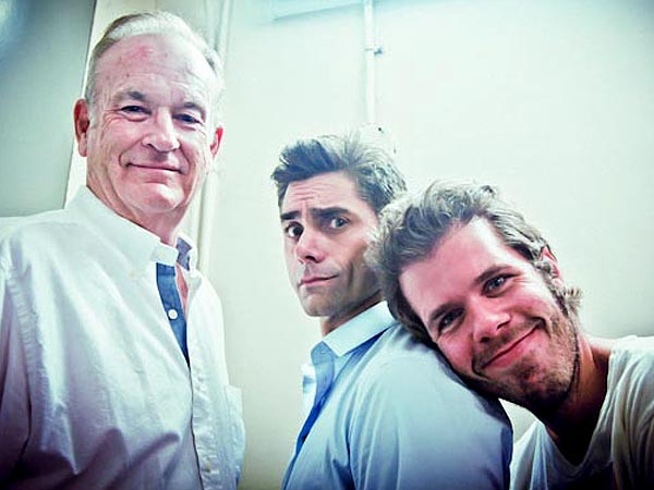 "I spend way too much time on it," he admits. "It's a double-edged sword: it's so great to be in touch with your fans, but the trap is that you're not really experiencing something. You're thinking, 'How am I going to Tweet this?' "Case in point? While decompressing after a recent show in his dressing room, "Bill O'Reilly and Perez Hilton came to my door," says Stamos. "Sounds like the beginning of a joke. It was pretty interesting negotiating the two of them. And all I [cared] about was getting a picture for Twitter." (If you're on a desktop, see the photo in the carousel above.)